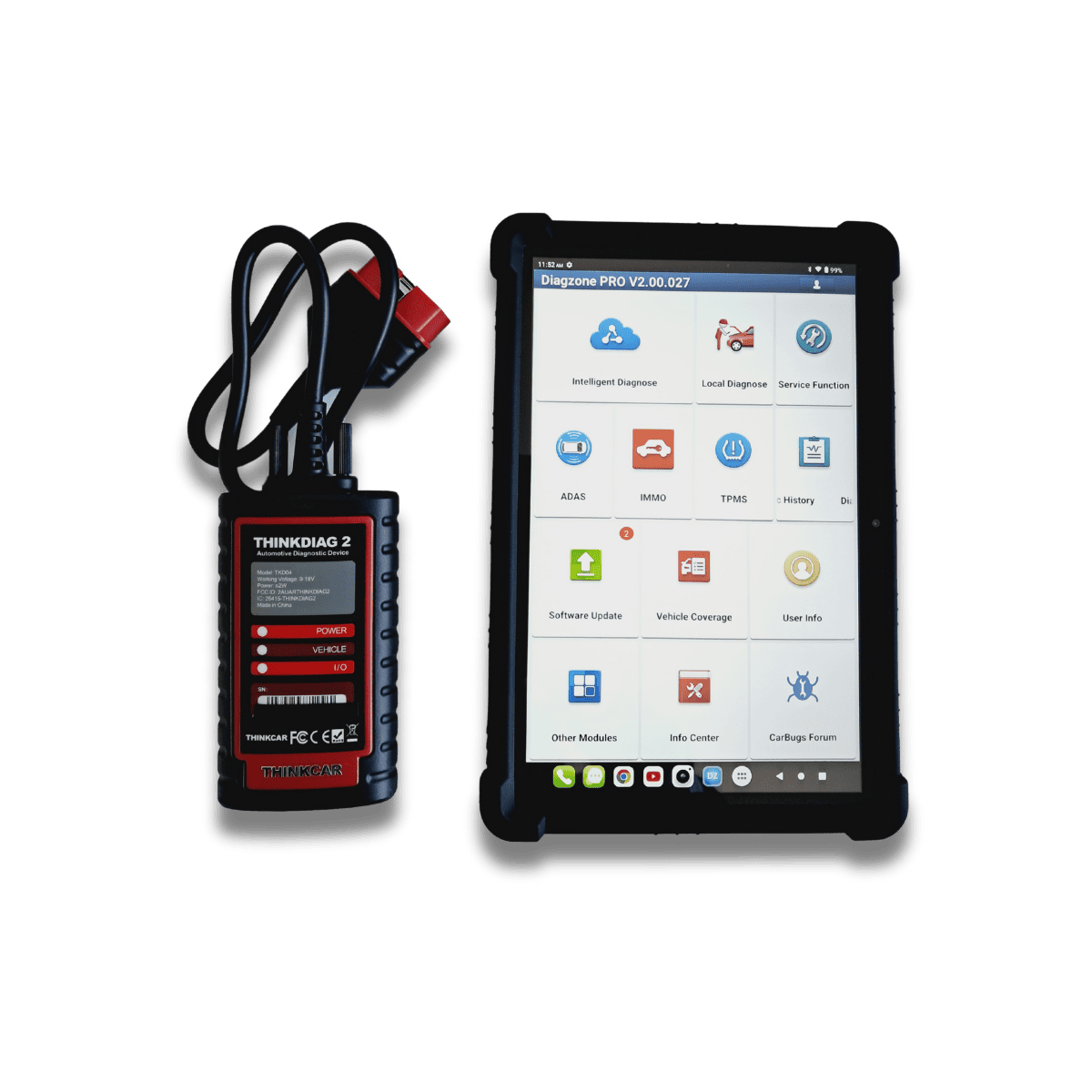 Modernus ir universalus automobilių diagnostikos įrangos rinkinys, skirtas autoservisams ir mechanikams, siekiantiems greitai bei tiksliai nustatyti transporto priemonių gedimus. Įranga leidžia ne tik skaityti ir trinti klaidų kodus, bet ir atlikti svarbias serviso funkcijas, padedančias prižiūrėti bei optimizuoti automobilio darbą. Rinkinį sudaro naujausia Diagzone ProV2 programinė įranga, veikianti su Android operacine sistema. Programinei įrangai reikalingas įrenginys su ne mažiau kaip 64 GB vidinės atminties (dėl suderinamumo su naujausiomis Android 15/16 versijomis rekomenduojama pasitikslinti). Taip pat komplekte yra Thinkdiag 2 OBD2 diagnostinė jungtis su prailgintu laidu ir Bluetooth 5.0 ryšio palaikymu. Šis diagnostikos komplektas užtikrina saugų, patogų ir greitą darbą.